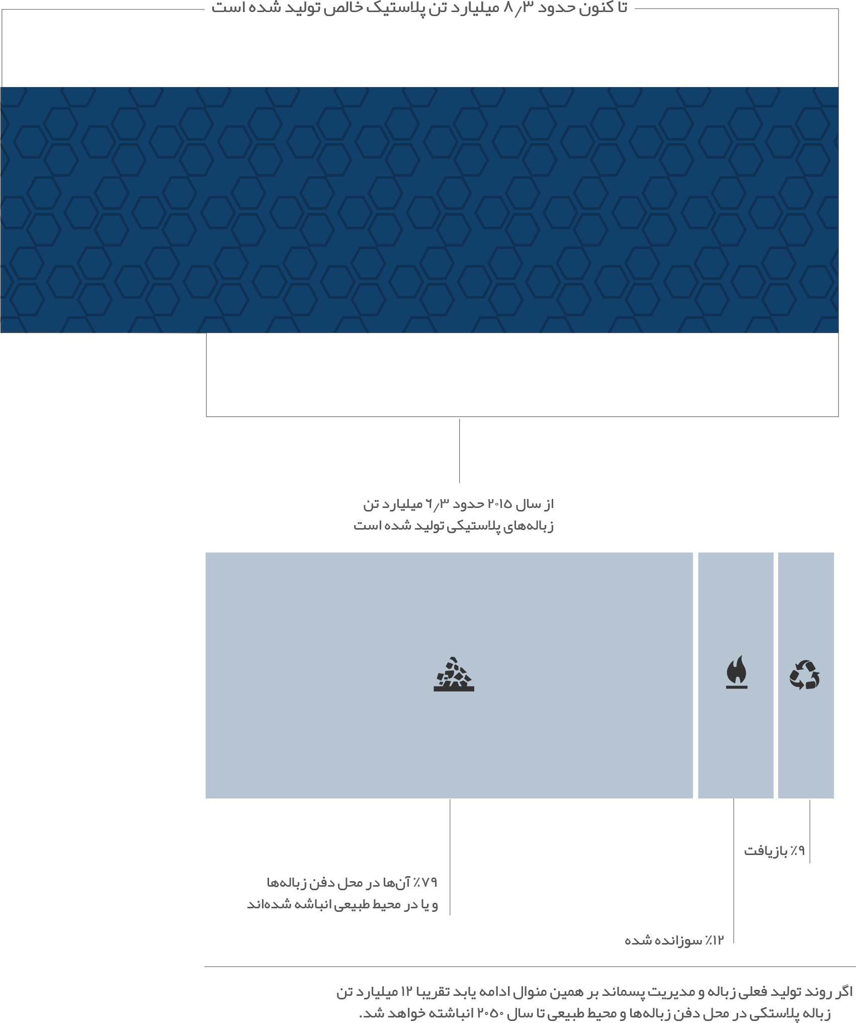 79% از تمامی پلاستیکهای تولید شده در محیط اطراف و یا در محل دفن زبالهها رها میشوند، این میزان گسترده تولید زباله از پیامدهای زندگی مدرن امروزی میباشد، بدین صورت که پلاستیک برای بسیاری از اقلام مصرفی دور ریز و یا یکبار مصرف از بطریهای نوشیدنی، نیها و کارد و چنگال و کیسه ها مورد استفاده قرار میگیرد.